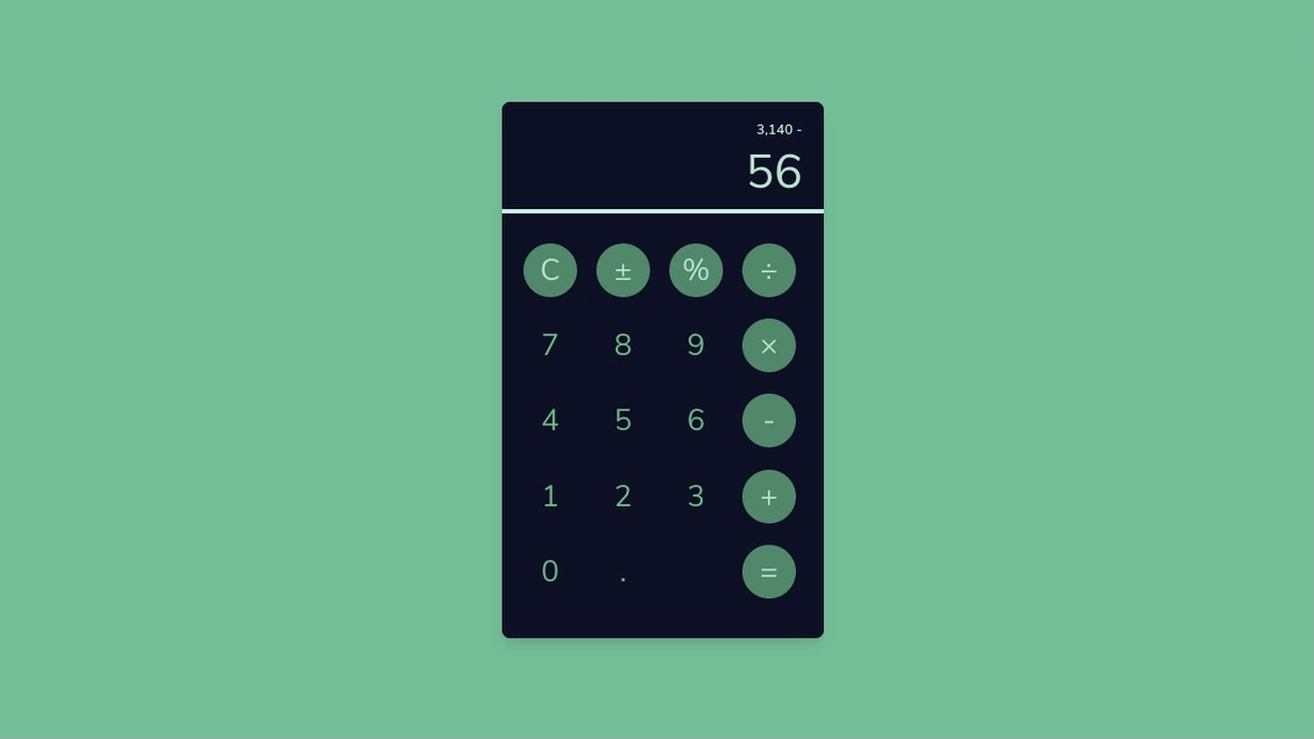 React-powered calculator with a stylish user interface. The expression is not evaluated until explicit computation is triggered by the user after the selection of an operator. Validation states are applied to buttons to minimize user error.