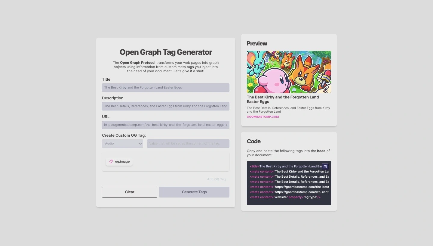Web application that dynamically generates Open Graph tags by using information derived from custom meta keys. The value set for all Open Graph tags is based on their meta counterpart or static placeholders, unless a custom value is specified.