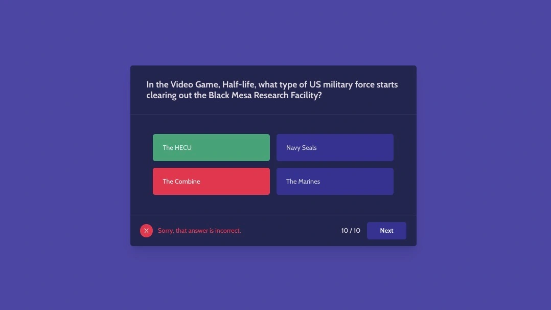 An intuitive trivia game that tests players on their knowledge of video games using questions from the Open Trivia API. Visual cues are used to indicate whether the player's selection is correct or incorrect, and their progress is tracked with each question.