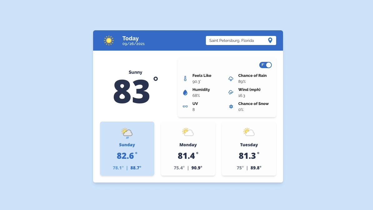 Web application that utilizes the WeatherAPI to generate a three-day weather forecast. Users can search by city and state or zip code to retrieve the forecast for their location. The forecast is visualized using a series of cards with current highlighted.